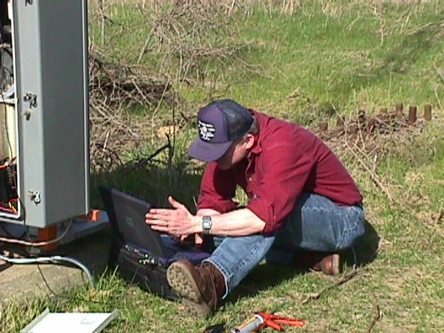 04-28-2001 - Kc8jev and myself made a trip to the repeater site and checked the SWR on both antenna's, both checked excellent, we hooked up the remote base and tested it, the remote base has been off line due to problems where we had to send it back under warranty for repair. Rob (Kc8jev took some pictures with the digital camera), a self portrait of Rob, inside the cabinet with all the stuff in there, me shielding the sun from my computer screen, the mysterious witness post and "the miners are coming!".